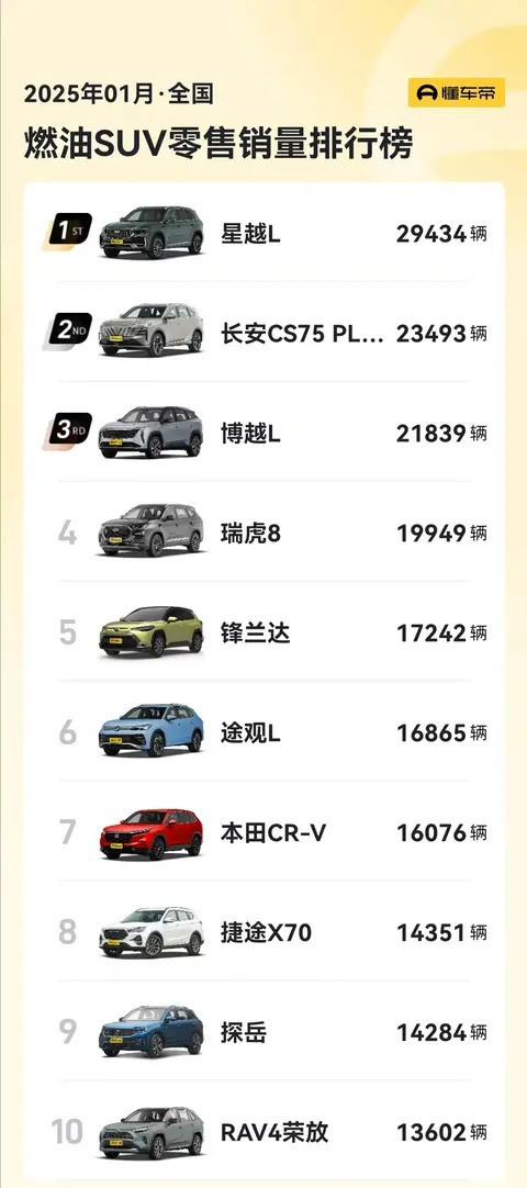 接下来,我们参考一份2025年1月的燃油SUV销量榜单,聚焦于前十名中价格接近15万元的家用燃油SUV。在这之中,哪一款会让你一见倾心呢?